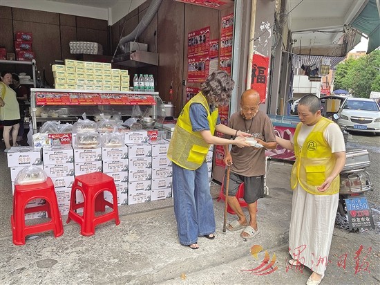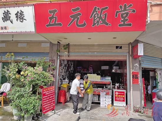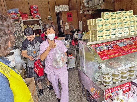 11时20分,远处走来一位拄拐老汉。李香珊看见,连忙迎上前,将老汉搀到五元饭堂前,林碧霞免费递了一份餐食给老汉。
