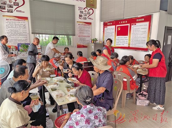 11时整,开餐时间到。义工们端着餐食一一送到驿站里的环卫工人和长者的餐桌上。