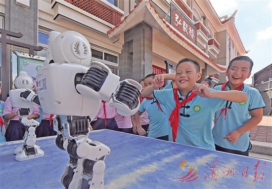 9月25日,在福建省泉州市泉港区后龙实验小学,学生和跳舞机器人互动。9月25日,福建省泉州市基层科普巡展活动走进泉港区后龙实验小学,现场通过开展科普讲座、无人机表演、机器人舞蹈秀等活动,让师生近距离感受科技魅力。新华社 发
