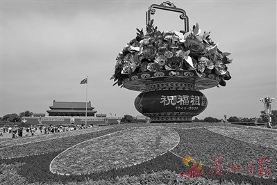 9月25日在天安门广场拍摄的“祝福祖国”大花篮。9月25日,2025年“祝福祖国”巨型花篮正式完工,亮相天安门广场与市民共度佳节。篮内选取了美好寓意的花卉,其中荷花寓意“和和美美”、橄榄枝寓意“荣耀和平”等,还结合和平鸽元素,体现“和平发展、欣欣向荣”。 新华社记者 鞠焕宗 摄