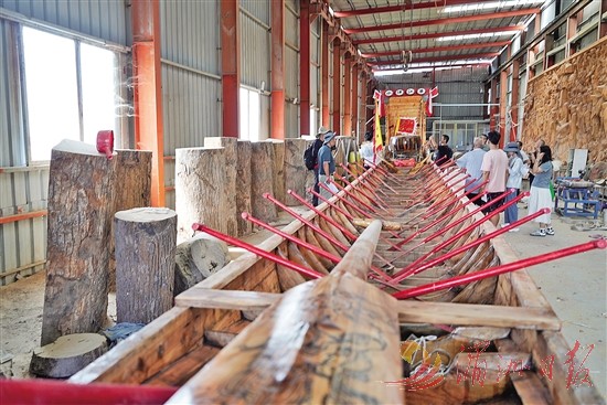 在华东村磐石宫,横卧着两艘老旧龙舟。华东村龙舟巡游队负责人陈俊锋介绍,这是村里的第一代和第二代龙舟,分别建造于1987年和2011年。为参加国庆期间的龙舟巡游活动,今年村里又购买了一艘新龙舟。以前的龙舟更宽更长,如今的龙舟较为狭窄轻巧,更利于竞技。