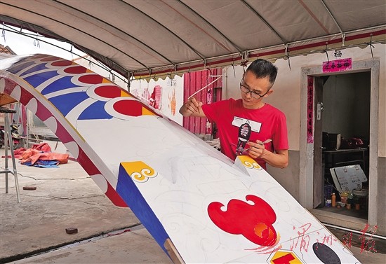 在磐石宫前,村里的年轻人陈嘉手持彩笔,专注地为新龙舟勾勒龙形图腾。他告诉记者,每艘龙舟的纹饰都要经历15道工序,光是绘画就要耗时5天。