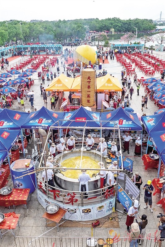 ▲位于白塘湖公园的活动现场,“天下第一锅”、超大蒸笼美食专区吸引市民、游客品尝地道莆仙美味。