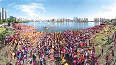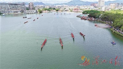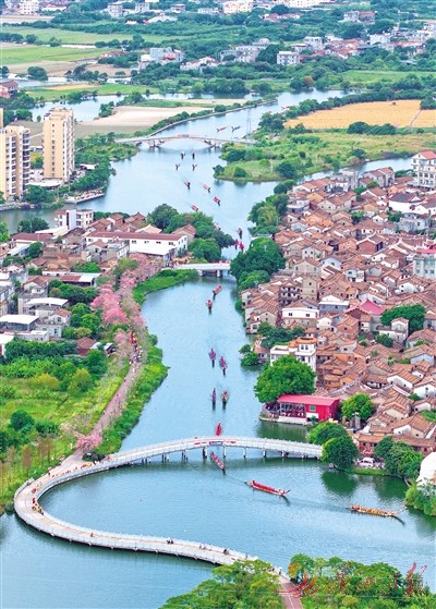 龙舟巡游,与清水、绿岸、粉花、民居、桥梁、田园等构成美丽画卷。
