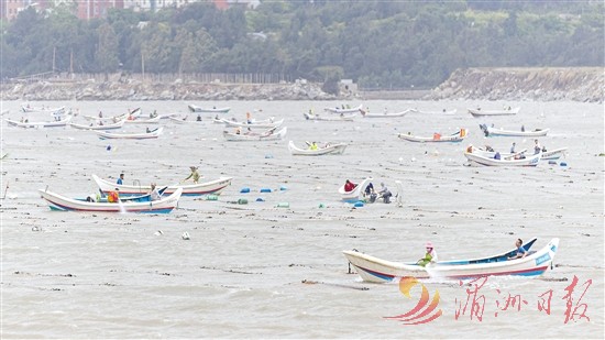 我市山亭镇蒋山村因得天独厚的山水环境和精湛的紫菜养殖技艺,被誉为“紫菜第一村”。图为金秋时节,蒋山紫菜海上泼苗,寄托着渔民们对丰收的期盼。全媒体记者 陈斌 摄