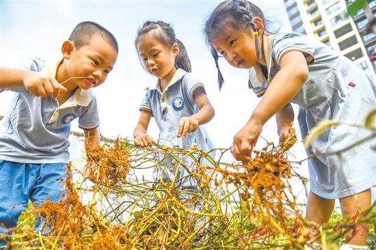 10月15日,在湖南省永州市道县城东幼儿园,小朋友在体验采收花生。10月16日是第45个世界粮食日,多地学校开展爱粮惜粮教育活动。今年世界粮食日的主题为“手拉手共倡多样美食,聚合力同创美好未来”。