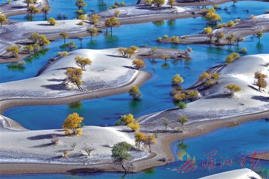 在新疆和田地区和田县翡翠湖,成片胡杨林坐落其中。时下,新疆和田地区的胡杨迎来最佳观赏期,成片换妆的胡杨林与水天相映,共绘金秋美景。
