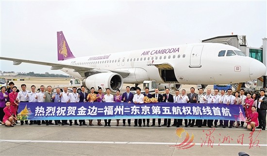 10月26日在福州长乐国际机场停机坪拍摄的首航庆祝仪式。10月26日,福建省首条第五航权客运航线“金边—福州—东京”航线正式启航。第五航权指一个国家的航空公司在经营某条国际航线的同时,获得在第三国经停并载运客货的权利。普通国际航线一般在两个国家间通航,一旦开放第五航权,则意味着航空公司可以在第三国载运客货,实现三个国家之间运输。该航线将柬埔寨金边、中国福州以及日本东京紧密相连,对于促进三国经贸文化交流合作以及区域经济发展等具有重要意义。新华社记者 林善传 摄