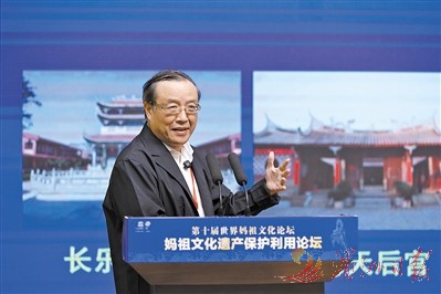 11月1日,在妈祖文化遗产保护利用论坛上,中国建筑学专家、博士,北京工业大学教授、泉州文化遗产研究院特聘教授杨昌鸣以《闽台妈祖建筑:传承与演变》为题,作了交流发言。他聚焦福建、台湾地区天后宫的建筑特色、历史演变与功能转型,结合具体案例,为妈祖文化建筑遗产的保护利用提供专业思路。