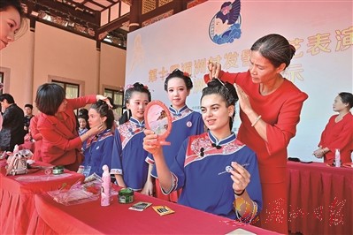 本报讯 (全媒体记者 郑已东/文 蔡昊/图)11月1日,第十届湄洲女发髻技艺表演暨湄洲女服饰展示活动在湄洲妈祖祖庙圣旨门广场举行。来自法国、缅甸、日本等国家的部分留学生现场体验湄洲女发髻(如图)。