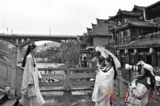 11月6日,外国游客身着“中国风”服装在凤凰古城拍照、游玩。凤凰古城位于湖南省湘西土家族苗族自治州凤凰县,沱江穿城而过,城内古建筑、特色民居众多。近年来,当地持续规范旅游市场,发展旅拍等旅游服务。游客们身着带有当地民族特色的服饰漫步沱江两岸,欣赏古城美景,感受民俗风情。
