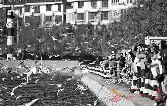 11月13日,游客在海河岸边观赏海鸥。近日,天津市迎来候鸟迁徙高峰,大批海鸥从寒冷的西伯利亚迁徙至滨海新区老码头附近的海河岸边越冬。 新华社 发