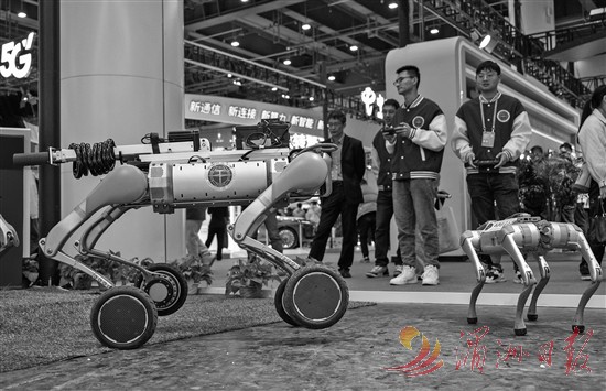 11月21日,参观者在2025中国5G+工业互联网大会展厅参观一款踏勘机器狗。11月21日至23日,以“万物互联 智能领航”为主题的2025中国5G+工业互联网大会在湖北武汉举办。新华社记者 杜子璇 摄