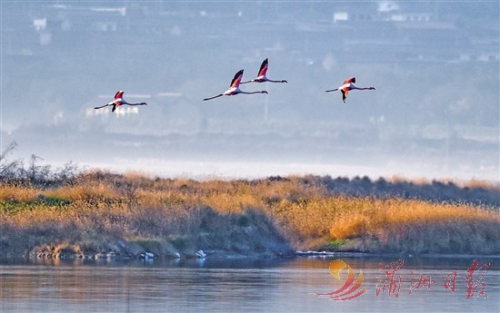近日,火烈鸟在山西省运城盐湖湿地飞翔。初冬时节,神州大地悄然开启了如诗如画的“美颜”模式。新华社 发