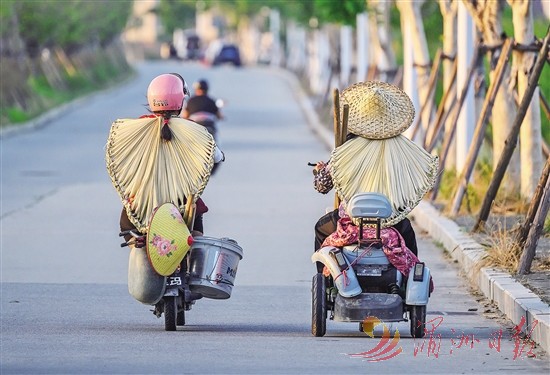 涵港大道黄石镇路段上,两个身披当地特色手编斗篷的村民正骑车回家。这种斗篷可防晒还能挡小雨,简单又实用。 蔡昊 摄