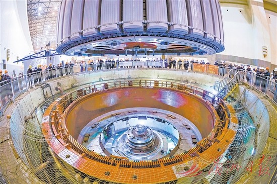 这是11月30日在检修现场拍摄的被起吊的发电机组转子。近日,福建水口水电站5号机组开始大修,计划总工期175天,主要任务为升级原有发电机组定子、转子、水轮机转轮等重要组件。水口水电站拥有7台发电机组,承担福建乃至华东电网的调峰调频、事故备用、闽江防洪防汛和通航等重要任务。