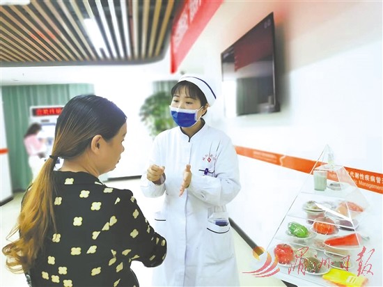 12月6日,记者来到城厢区医院5楼,只见国家标准化代谢性疾病管理中心(MMC)旁,加挂了城厢区域慢性病管理中心的牌子。在科普区,护士指着“中国居民平衡膳食宝塔”模型,向一名糖尿病患者讲解如何“吃好饭、管好病”。