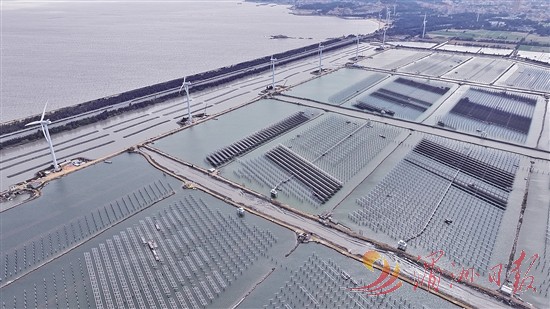 本报讯 连日来,湄洲华润忠门A区100MW渔光互补光伏电站项目建设正酣。一片“水上发电、水下养殖”的绿色能源矩阵正加速成型。