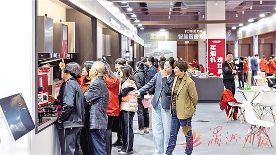 方太品牌展区被布置成现代厨房实景,智能吸油烟机、嵌入式洗碗机等产品正在运转,直观展示其各项功能。方太莆田区域经理郑海东一边引导顾客体验产品,一边介绍相关优惠政策。