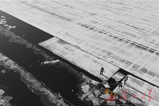眼下,“冰城”哈尔滨采冰工作全面展开,采冰工人从松花江上采出优质冰料,源源不断地运往冰雪大世界园区等地,用于景观建设。图为工人在松花江哈尔滨段采冰。