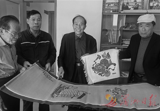 在东海镇金沙宫,76岁的金沙宫副董事长蔡红苗对琉球狮子印象深刻。他与同事找到了琉球蔡氏宗亲首次认祖归宗时交换的“信物”——一块印有“琉球红型”字样的麻布印花狮子,图案为狮子戏球,形态可爱。