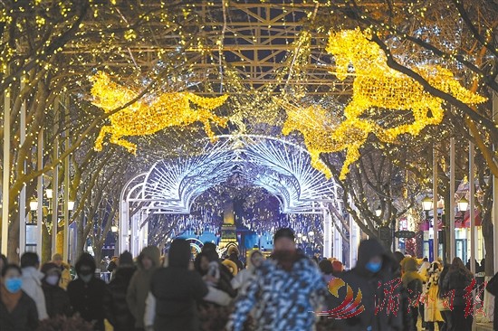 这是哈尔滨中央大街上以“冰雪迎宾 瑞马迎新”为主题的创意灯饰。12月以来,哈尔滨进入冬季旅游旺季,中央大街上游人如织。作为哈尔滨市闪耀的城市名片,中央大街在丰富多彩的创意景观与灯饰装饰下显得格外动人。夜幕降临,华灯初上,游人徜徉其中,尽享当地独特文化魅力。