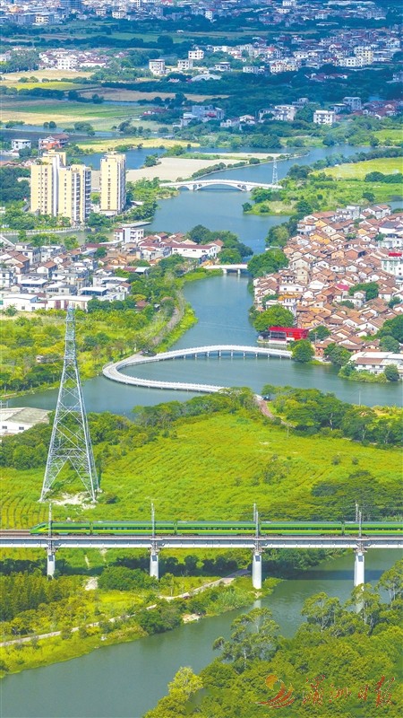 我市通过水系治理、古桥保护与交通升级,实现“荔林水乡”肌理与现代交通的和谐共生,展现千年古城守护生态底色、激活文旅潜力的发展图景。图为昨日,涵江区白塘镇陈桥村附近,向莆铁路木兰溪特大桥与周边古朴石桥一道,串联起传统村落,形成一幅碧水绕村、荔林掩映的生态美景。 全媒体记者 蔡昊 摄
