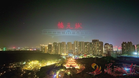 12月20日晚,百架无人机在绶溪公园上演光影盛宴,呈现延寿桥、绶溪桥、状元桥、古荔枝“状元红”等图案,彰显地域文化特色。 全媒体记者 杨洲 摄