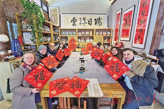 2025年12月,入境旅游策划师孙姝俐团队带领外国游客在北京大栅栏街区体验中国书法。新华社 发