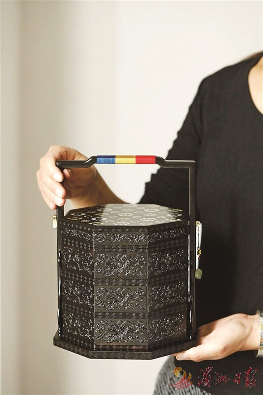 图②:林如常夫妇的作品——紫光檀“五福捧寿”提盒。