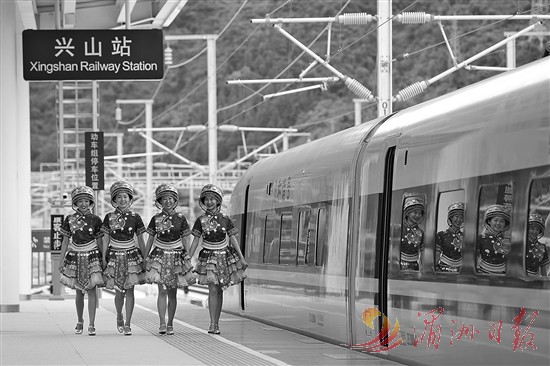 2022年6月20日,郑渝高铁实现全线贯通运营。这是在郑渝高铁兴山站,身着表演服的列车乘务员准备乘车为乘客表演节目。2025年12月26日,西安至延安高铁开通运营,革命老区延安迈入“高铁时代”。至此,中国高铁运营里程突破5万公里,高铁发展再上新台阶。新华社 发