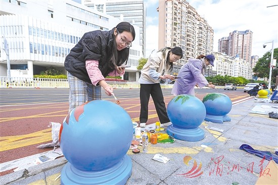 莆田三中的师生们把莆田各地地标用手绘的形式画在校门口的石球上,为我市中心城区首条精致路学园中街增光添彩。图为12月中旬,该校师生在石球上绘画。