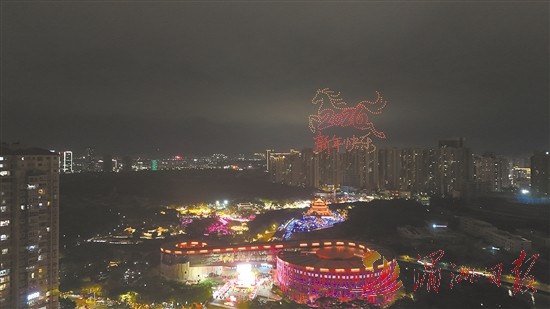 夜空中,无人机编队在状元楼上空变幻出“勇敢迈向新的一年”“2026好运UP”等精美造型,同步直播画面让现场与线上观众共享视觉盛宴。“新的一年,希望万事胜意,日子越来越火红。”市民林梅芳在观赏表演时许下新年期许。