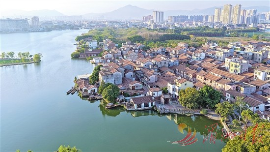 白塘湖畔,红瓦古厝、澄澈湖水与现代高楼相映成趣,尽显城乡融合发展的生动景象。图为1月4日,晨光中的涵江洋尾古村。 全媒体记者 杨怡玲 摄