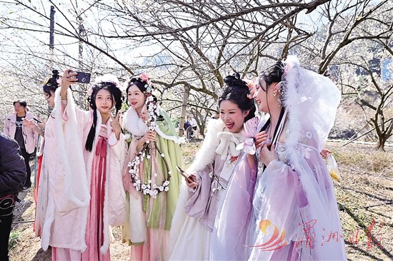 1月10日,一群穿着古装的女孩在福建省永泰县葛岭镇文埕湾的梅园游玩、拍照。时值青梅绽放时节,1月10日,福建省福州市永泰县一年一度的梅花季系列活动在葛岭镇溪洋村文埕湾拉开帷幕,吸引众多游客前来打卡游玩。 新华社记者 姜克红 摄