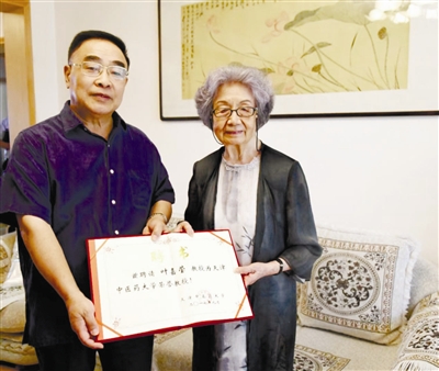2021年2月20日,农历正月初九,受张伯礼院士委托,毛国强教授和张海涛副教授来到叶先生家中拜访,向她致以新春佳节的问候,祝贺她刚刚获得“感动中国2020年度人物”,并赠送张伯礼院士总主编、毛国强主编的《中医名家谈节气养生与防病》精装套书,还向她介绍了学院组织的学生古诗词吟诵活动,她听后十分高兴。叶先生对学院传统文化教学研究十分关心,倾力支持。2021年学院举办传统文化与美育学术论坛时因不能到场,她贡献了她的精彩讲座视频,当天论坛现场和在线收听收看的师生超过1600多人。