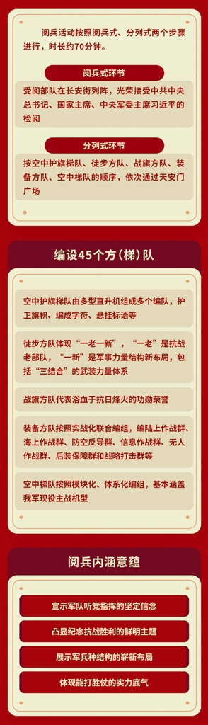 阅兵活动将按照阅兵式、分列式两个步骤进行,时长约70分钟。其中,在阅兵式环节,受阅部队将在长安街列阵,接受中共中央总书记、国家主席、中央军委主席习近平的检阅。在分列式环节,将按空中护旗梯队、徒步方队、战旗方队、装备方队、空中梯队的顺序,依次通过天安门广场。