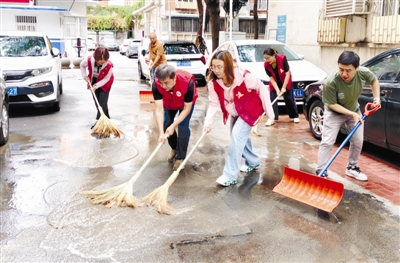 日前,和平区新兴街卫津路社区组织志愿者,针对连日来的降雨天气,及时清扫路面积水。 肖怿国 摄
