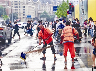 8月21日,在和平区天河城购物中心附近,环卫工作人员雨后清理马路积水。 史 嵩摄