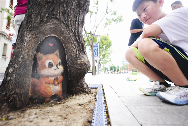 有趣的树洞画吸引市民观看 记者 肖怿国 摄