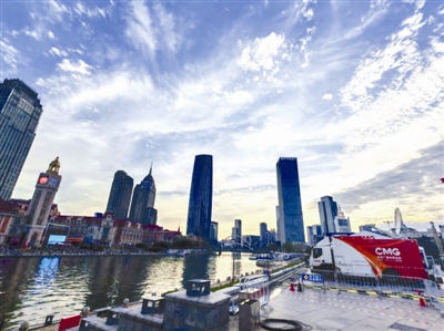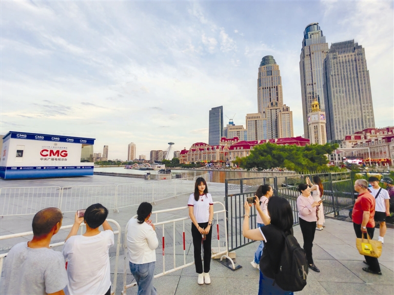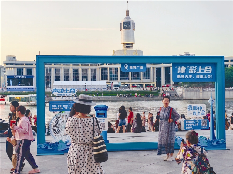 海河畔天津站前广场的总台外景演播室将海河风光与峰会元素结合,吸引大量市民、外地游客前来打卡,大家纷纷以直播间为背景拍照。而与天津站前广场隔河相望的津湾广场,新添了一处上合主题相框景观,由于将天津站风光巧妙“框”入其中而格外吸睛,每天都吸引众多游客驻足拍照打卡。