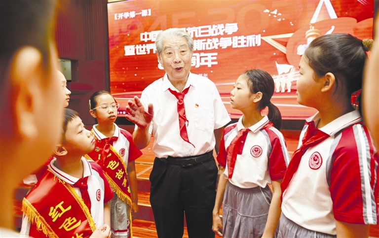 近日,和平区关工委“五老”宣讲团常务副团长张振东,走进天津市和平区西康路小学,带来一场别开生面的红色讲座。活动伊始,学校领导为张振东颁发“红色教育校外辅导员”聘书,少先队员献花致敬。随后,张振东爷爷以“铭记历史 致敬英雄 争做时代新人”为主题,和学生宣讲团成员一起,依托五大道历史建筑,讲述抗日英雄故事。一个个饱含家国情怀的故事,带领师生重温峥嵘岁月,厚植爱国情怀,传承红色基因,激励着全体师生在新学期勇担使命,争做时代新人。 记者 史 嵩摄