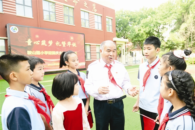 国庆前夕,鞍山道小学以“升旗仪式+红色宣讲”开展爱国教育活动,特邀“五老”代表、和平区“老战士宣讲团”团长孙志才老人进校园。