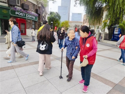 图① “老雷锋”志愿者搀扶老人,“小老”帮“老老”。图② 游客向志愿者表达谢意 图③ 志愿者在民园广场巡逻 姚 华摄