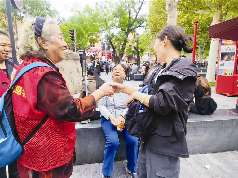 “您往我手指的方向再走个100米左右,就能到民园西里啦!”“您看前面那一片小洋楼,去那儿拍照打卡最出片!”10月6日下午,阳光洒在五大道街区的十字路口,七旬老人俞军站在路口,手中的旅游地图在阳光下泛着光。作为和平区“老雷锋”、福林里社区志愿者协会会长,她声音洪亮且热情,正耐心地为初来乍到的游客指引着方向。