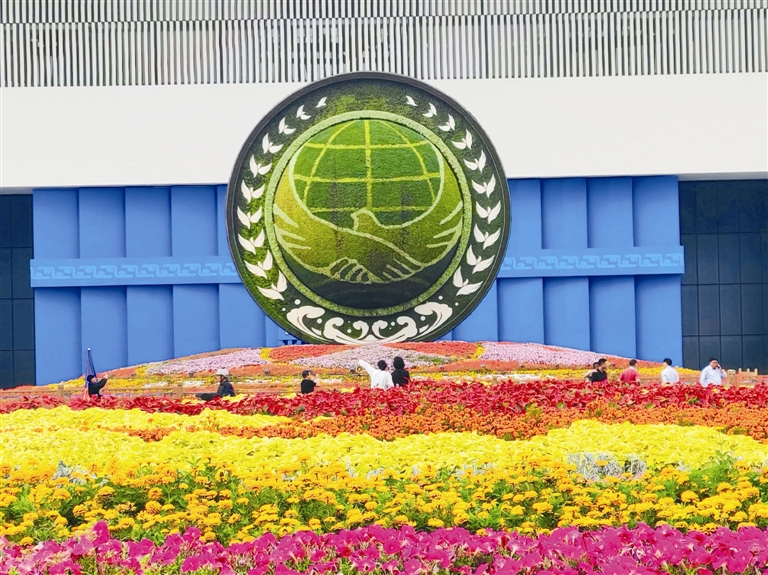 近日,河西区梅江会展中心的《合作·共赢》主题花卉景观人气爆棚,成为市民游客的热门打卡地。这处为上合峰会打造的景观,以生态绿植构建的核心造型极具视觉冲击力。球形主体似微缩地球,表面经纬线清晰,抽象的双手与和平鸽造型浑然一体,传递着合作理念。周边花坛与主体遥相呼应,色彩斑斓且层次丰富。不少游客将这里列入来津游玩的必选景点之一。 记者 史 嵩摄