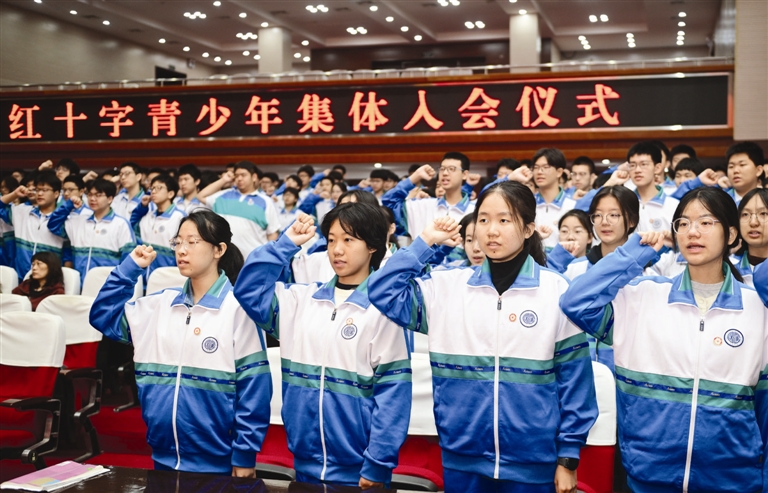 近日,和平区红十字会与区教育局联合主办红十字青少年集体入会仪式。全体新会员庄严宣誓践行“人道、博爱、奉献”的精神。学生们还通过现场实操教学,掌握了心肺复苏、伤口包扎等技能。 记者 史 嵩摄