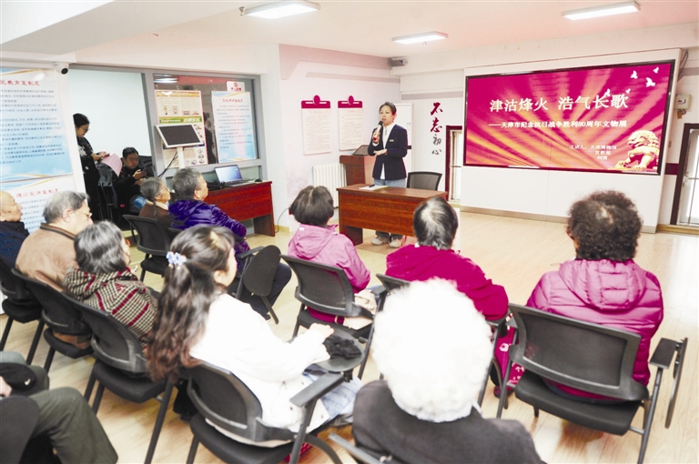 天津博物馆宣讲团成员刘清带来 “津沽烽火 浩气长歌”主题分享,一幅幅泛黄的革命文物图片在现场徐徐展开,将在场居民带回战火纷飞的年代。“天津博物馆馆藏革命文物达8000余件,占全市首批可移动革命文物名录的一半以上。”宣讲后刘清介绍,从毛泽东在开国大典上穿过的绿呢制服,到天津市人民政府升起的第一面五星红旗,这些珍贵文物承载着厚重的历史记忆。此次她将馆内抗战文物展览“搬”进社区,用群众听得懂的语言解读文物背后的故事,让红色文化真正触手可及。