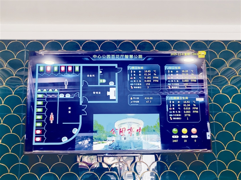 此次升级聚焦老年人使用痛点,以“细节适配、安全优先、舒适升级”为原则,实现硬件设施与服务体验双提升。通风方面,配备智能喷雾除臭机与厕位专用排风口,搭配环境指标实时监测系统,对温度、湿度、空气质量等进行精准把控,一旦指标超标便自动启动净化程序,彻底改善了传统公厕通风不畅、异味滞留的问题,让老年群体在使用过程中始终能呼吸到清新空气,有效避免因闷热、异味引发的不适。入口处的电子显示屏采用大号清晰字体与高对比度设计,明确标注男女厕位及小便池数量,以绿灯、红灯直观区分空闲与使用状态,老年人无需凑近就能快速识别,轻松避免盲目等候。