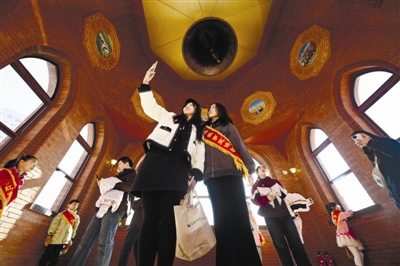 图① 张振东讲五大道故事 图②图③ 宣讲团成员和学生参观钟楼
